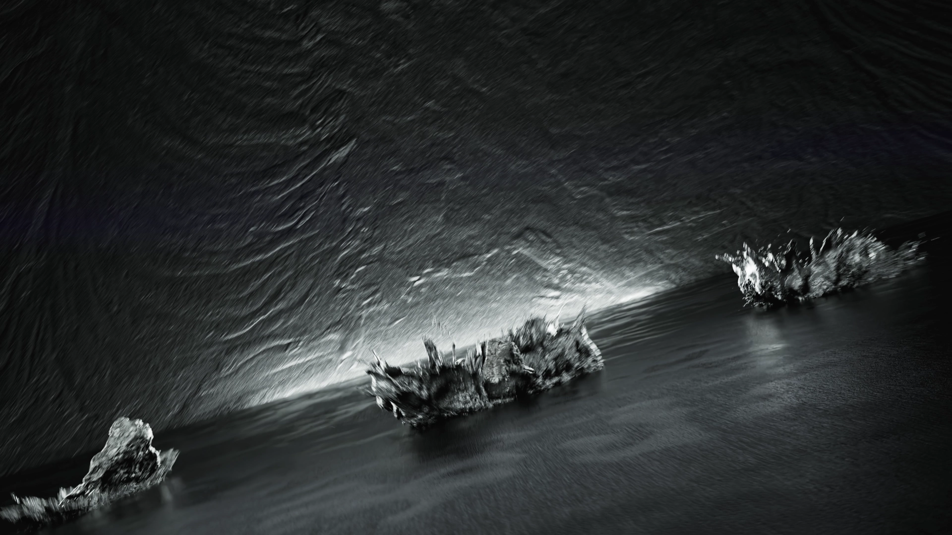 The visual tone is dark and industrial, supported by clean lighting. The palette is dominated by blacks and greys, with a subtle hint of blue in the highlights. The rock begins as a dark object and transitions into an equally dark liquid. Only at the end, during the freezing phase, does the blue tint spread across the surface, emphasizing the cold crystallization.