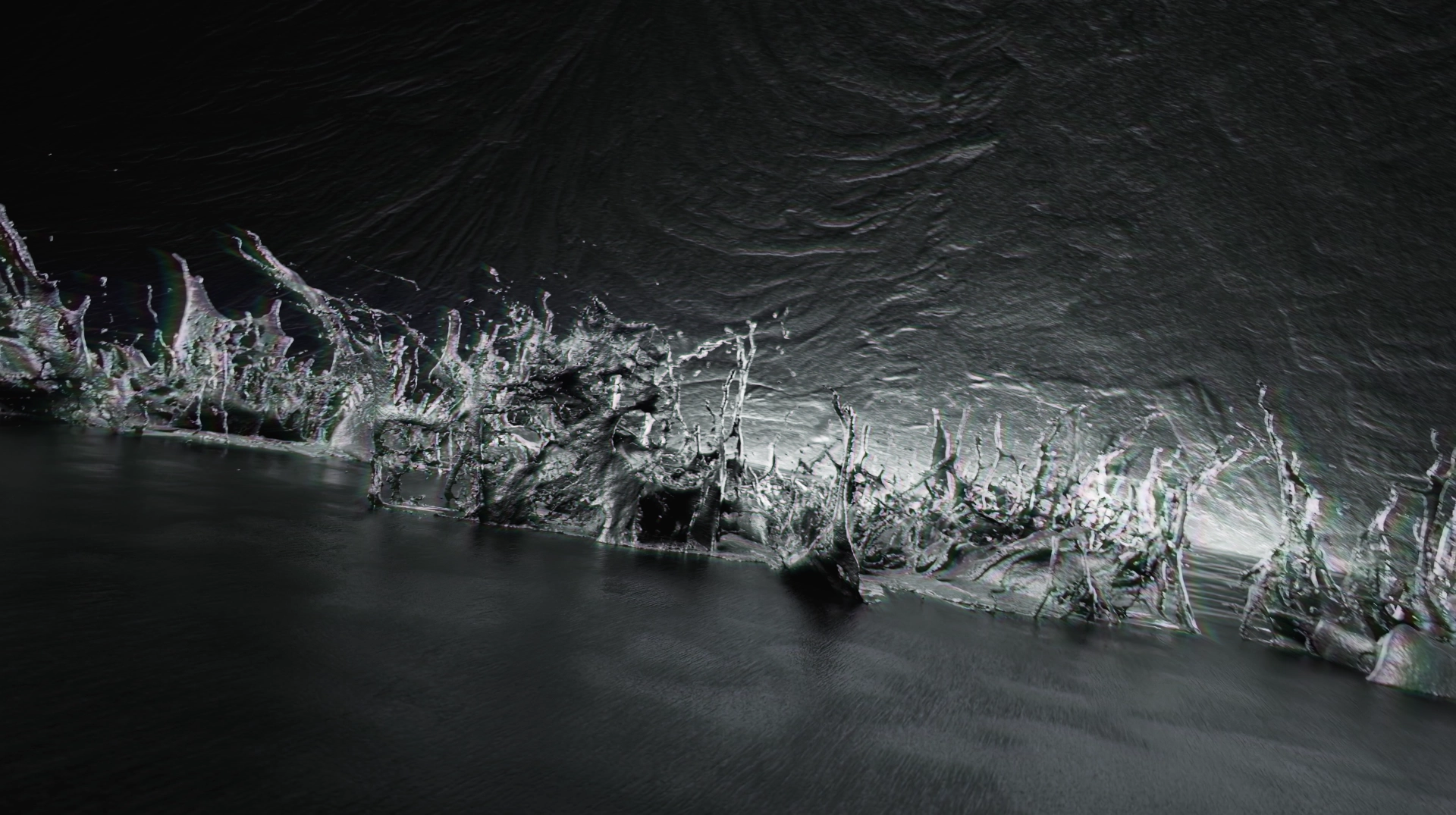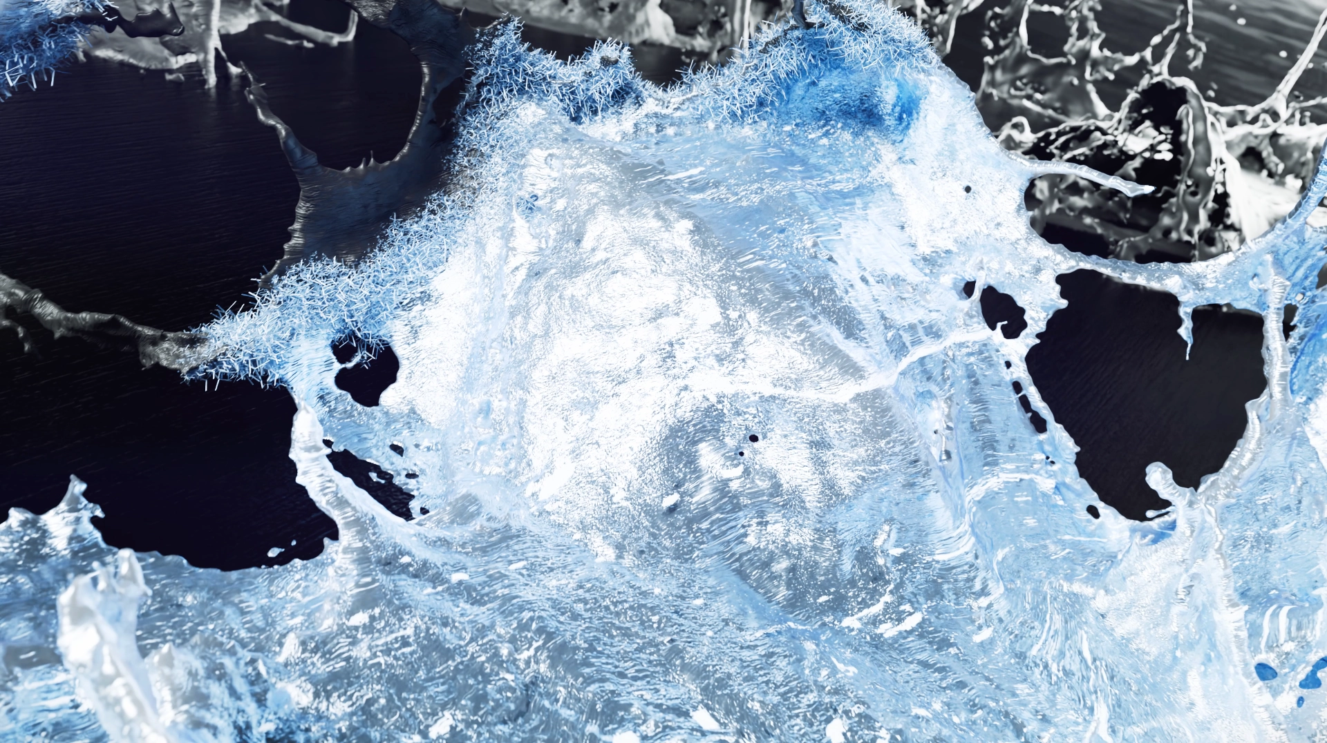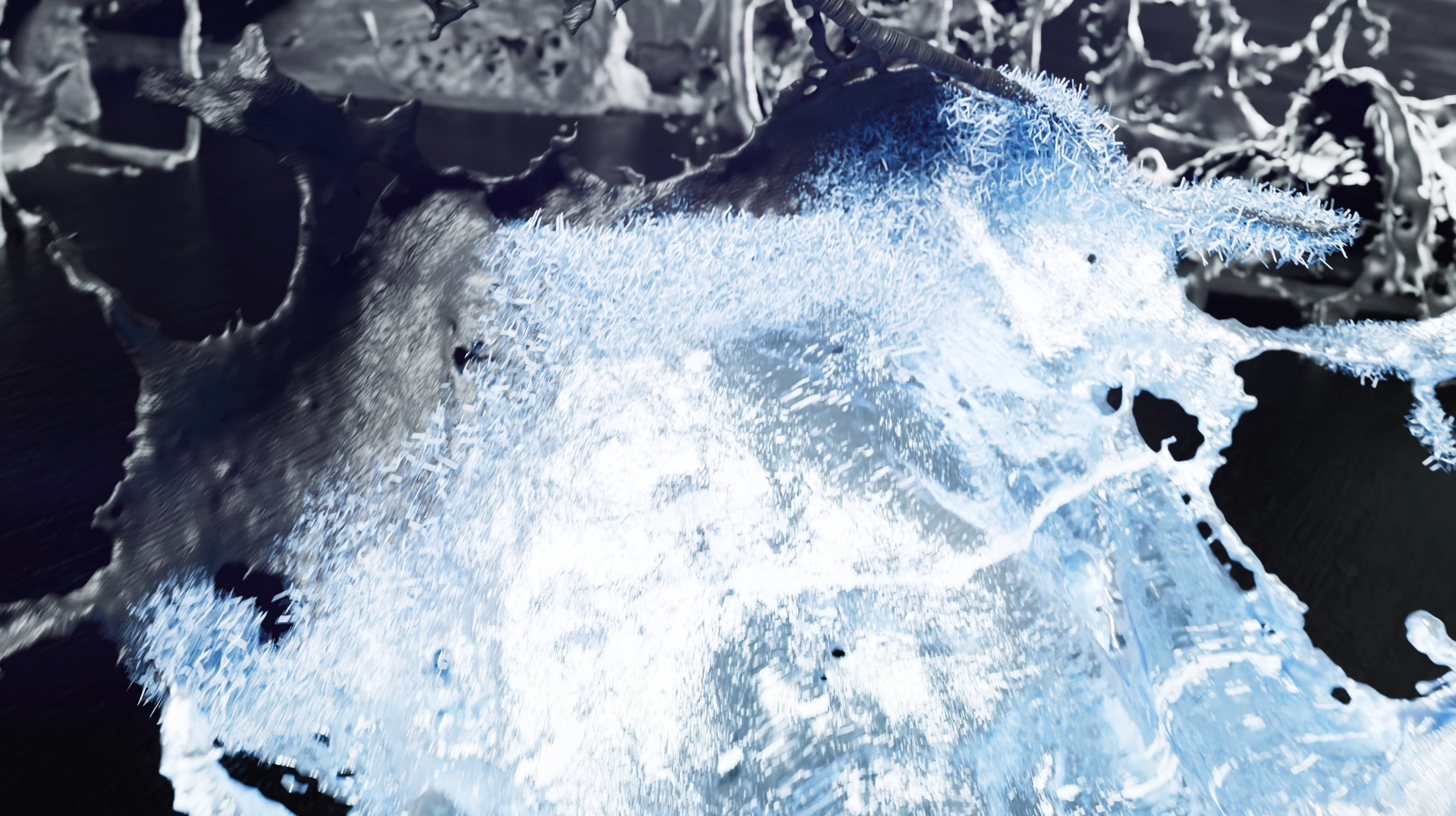 The rock setup and camera animation were handled in Blender. For the melting and splash phase, Houdini was the main tool, where we experimented with a more unconventional approach to dissolving a solid and forming a liquid simulation. Achieving a convincing splash required many iterations. The freezing effect was created through a custom growth mask that drives the frost expansion.