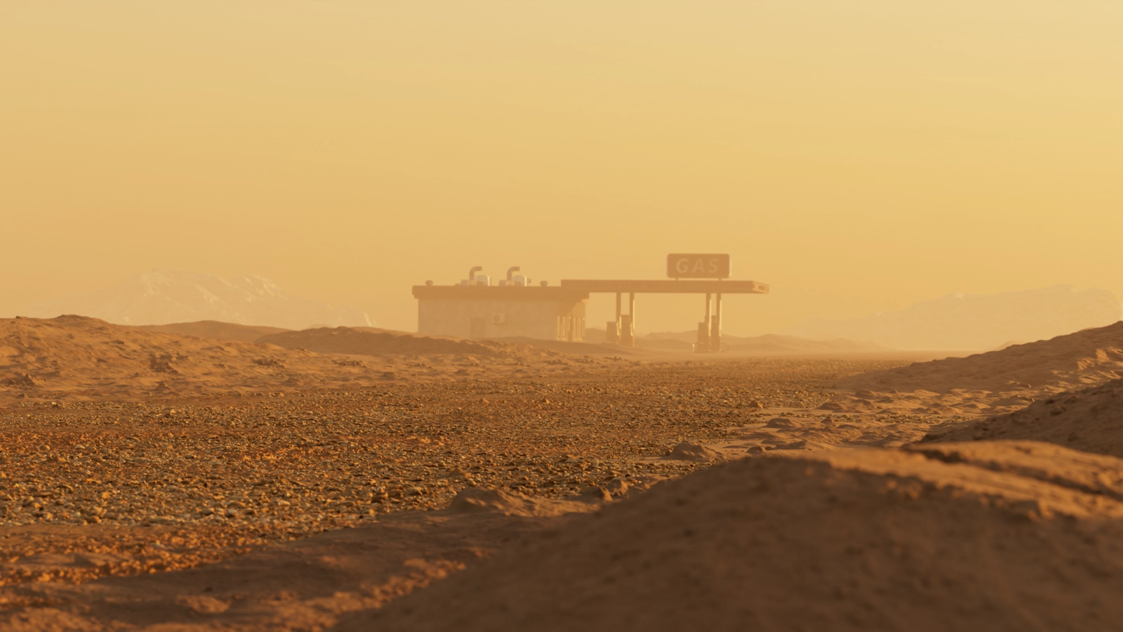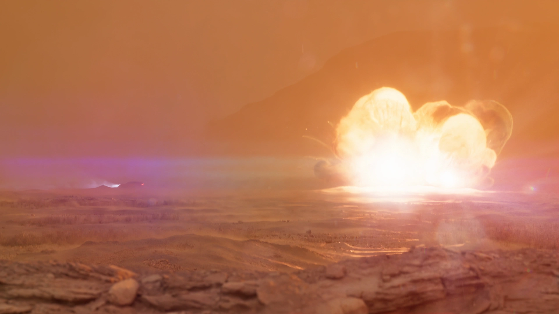 - Setting: Desert environment with strong wind, lightning strike, and a distant explosion